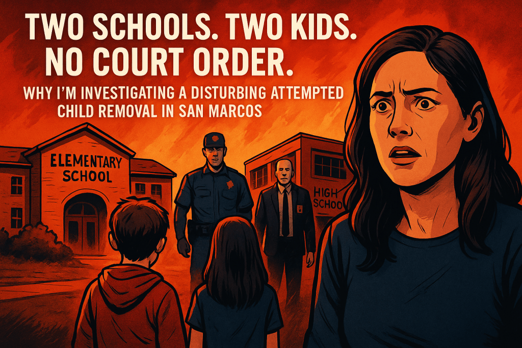 Officials from multiple jurisdictions—reportedly including the San Diego County Sheriff’s Department, Child Protective Services (CPS), and the Los Angeles County District Attorney’s Child Abduction Unit—arrived on two separate school campuses in San Marcos with the apparent goal of removing a mother’s two children: her daughter from Mission Hills High School, and her son from Double Peak School.