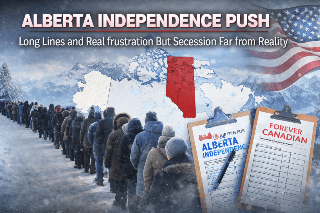 Viral images circulating this week show long lines of bundled-up Albertans standing in freezing temperatures in Edmonton, waiting hours to sign a petition calling for Alberta to separate from Canada. Social media posts—most notably amplified by U.S. commentators—have framed the moment dramatically: a province on the verge of secession, perhaps even angling to become America’s “51st state.”