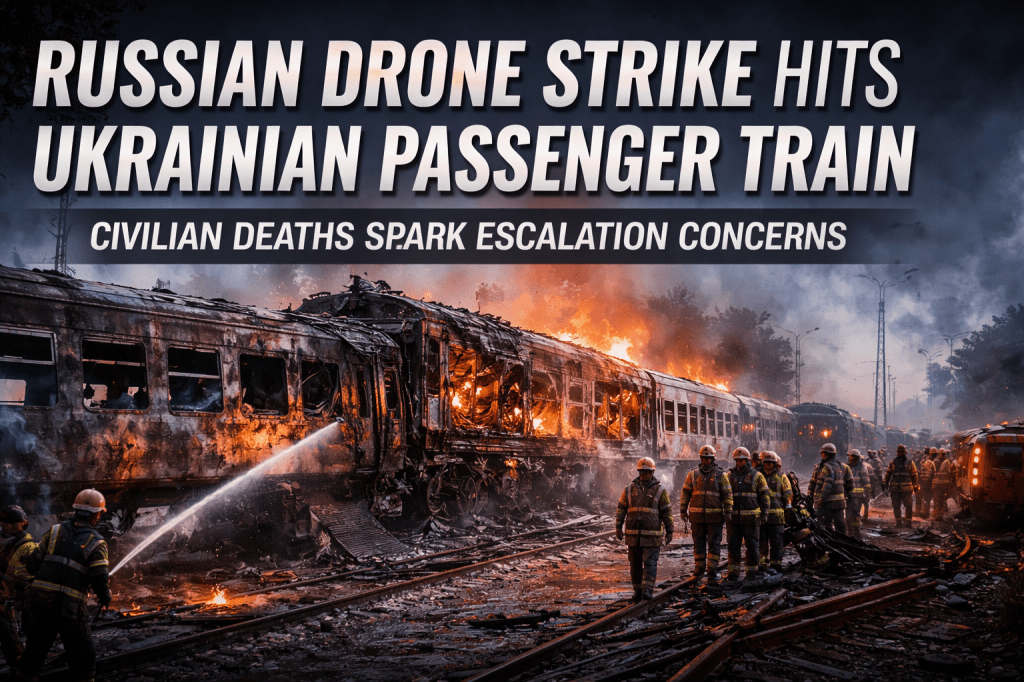 According to Ukrainian officials and emergency responders, a Russian drone struck a civilian passenger train traveling through central Ukraine on Tuesday. The blast ripped through multiple carriages, triggering fires and injuring dozens of passengers.